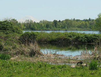 The Union Bay Natural Area, or "Montlake Fill", is one of the premier birding sites in Seattle, because it is an island of wild in a sea of urbanity. The "fill" is a former landfill located in the heart of northeast Seattle on the banks of Lake Washington. It was built on a peat marsh created when Lake Washington was lowered in the early 1900s. When the landfill closed in 1966, the city capped the garbage with clay, covered by a thin layer of soil. Over the years, the land has settled into gentle hills and valleys landscaped into grasslands, with riparian vegetation and marshes. Various temporary and permanent ponds have formed, surrounded by poplars, willows, cattails, and invasive plants. The University of Washington, which owns and manages the property, is currently trying to seed the site with native vegetation, but much remains to be done.